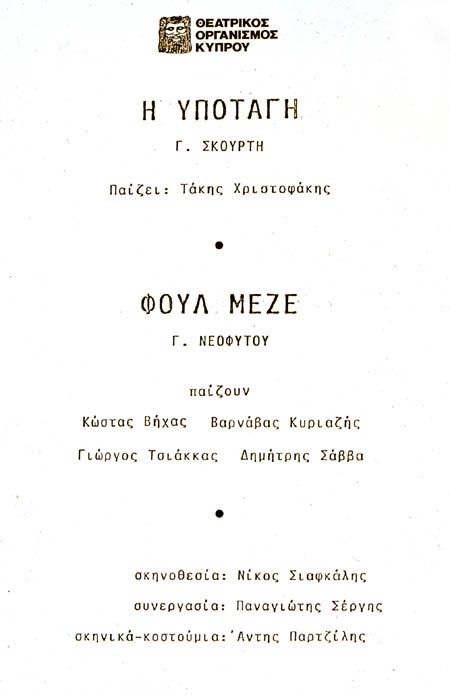 Πρώτη παράσταση: 7 Ιουνίου 1989, Δημοτικό Θέατρο Λευκωσίας.