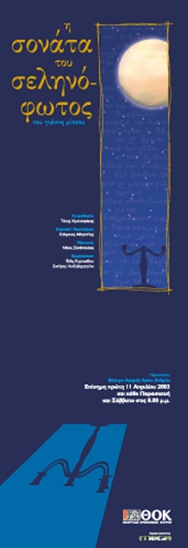Γιάννη Ρίτσου Η ΣΟΝΑΤΑ ΤΟΥ ΣΕΛΗΝΟΦΩΤΟΣ Από 11 Απριλίου 2003 Πειραματική ΣκηνήΘέατρο Αγοράς Αγίου Ανδρέα Ρεπερτόριο ΓλώσσαΕλληνικά Share on facebook Twitter Πρώτη παράσταση: 11 Απριλίου 2003, Θέατρο Αγοράς Αγίου Ανδρέα, Λευκωσία. 1/5 2/5 3/5 4/5 5/5 ΤΑΥΤΟΤΗΤΑ ΠΑΡΑΣΤΑΣΗΣ Συντελεστές Τάκης Χριστοφάκης Σκηνοθεσία Στέφανος Αθηαινίτης Σκηνικά-Κοστούμια Χρίστος Ζανόπουλος Μουσική Διανομή Έλλη Κυριακίδου Γυναίκα με τα μαύρα Σωτήρης Χατζηδημητρίου Νέος
